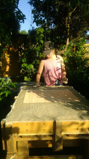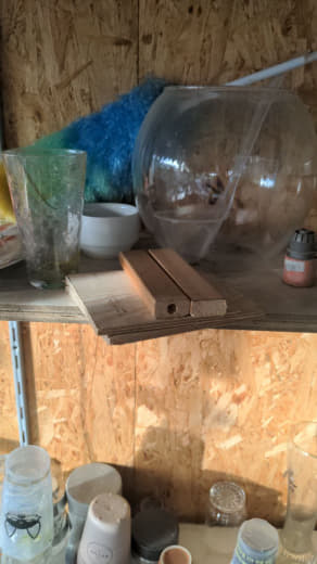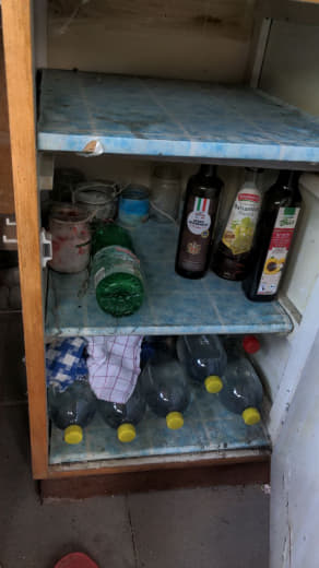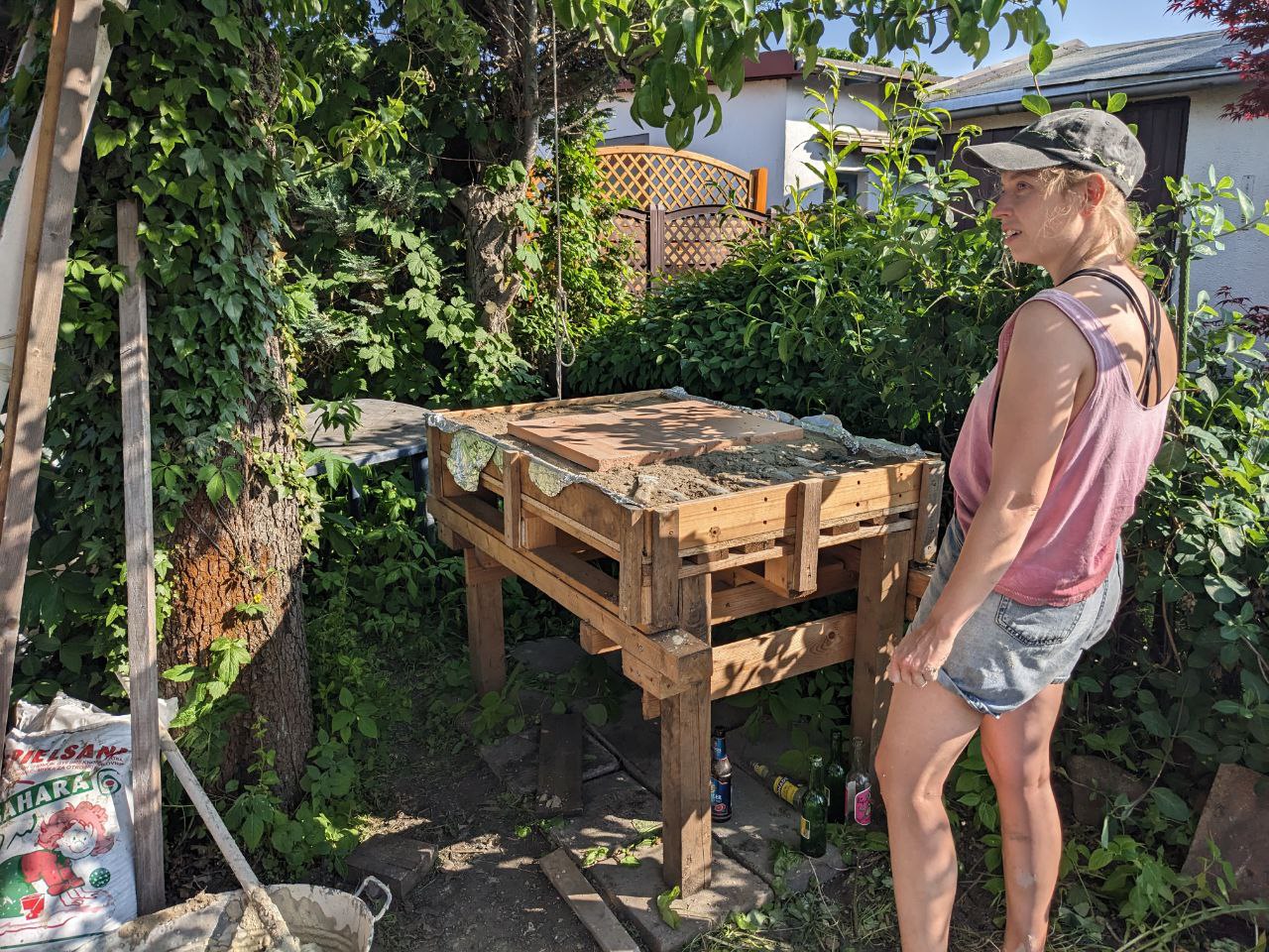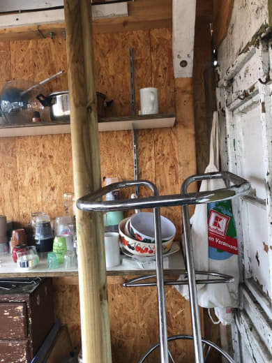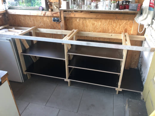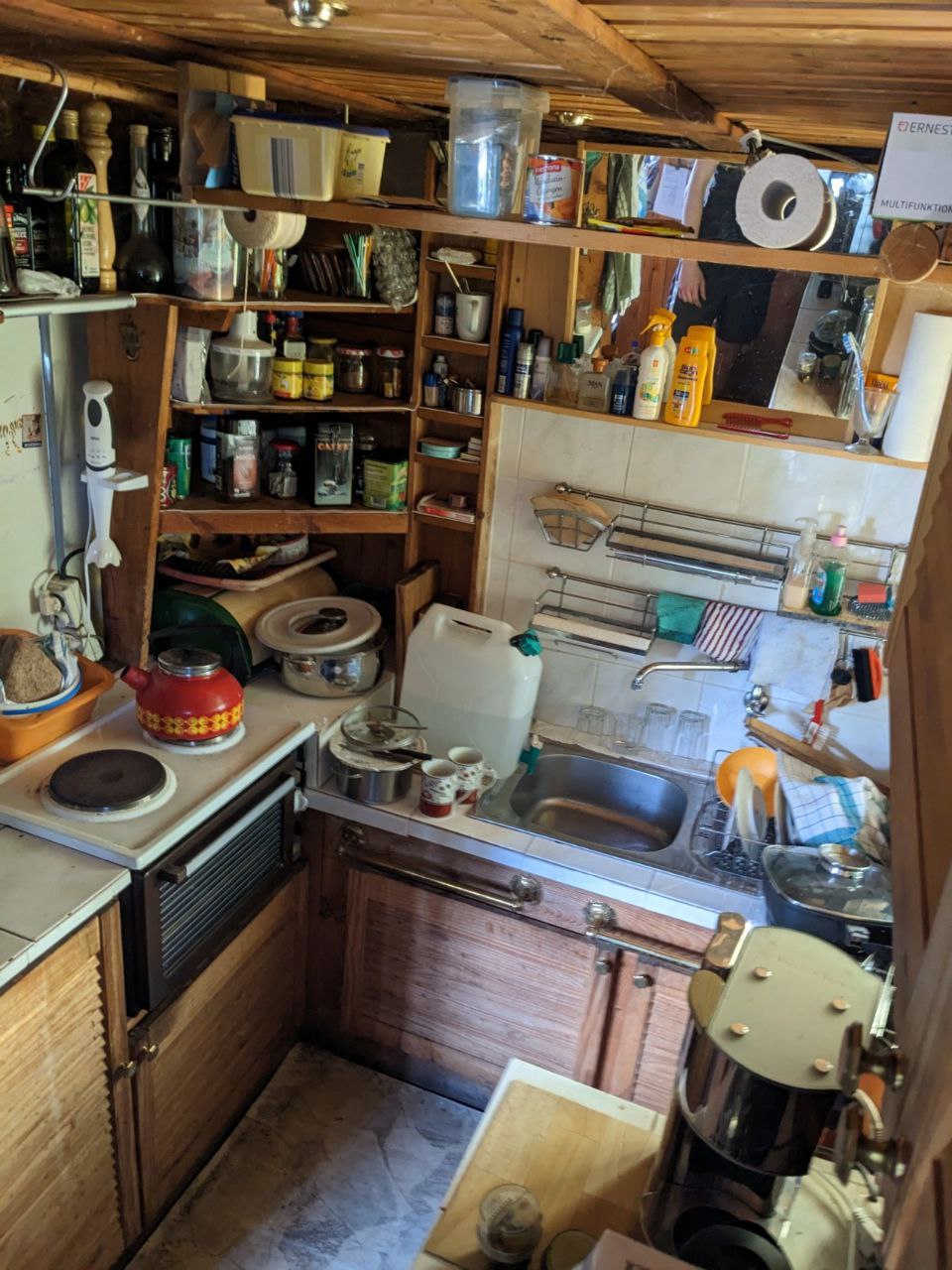 5. Küchenausbau: von vorne gesehen links soll eine Arbeitsfläche mit Fächern und Platz für den Kühlschrank untendrunter entstehen; Hinein könnte man Kunststoffboxen z.B. von Ikea stellen sodass Teller etc wasser-