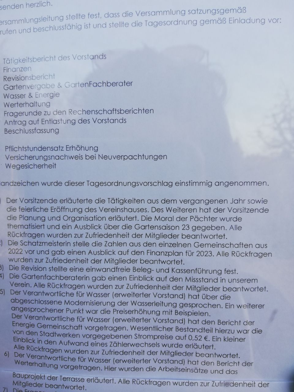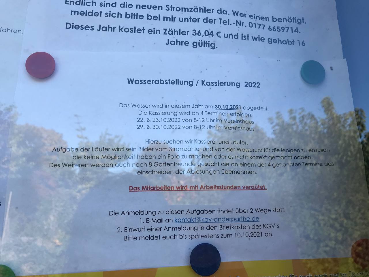 2. Mahnung: Es gibt wohl eine neue Mahnung wegen Strom/Wasser; Eigentlich ist organsiatorisch alles geklärt und wir waren bei der Zählerablesung anwesend, im Vorstand ging wohl was schief. Edwin hat einen Widerspruch und eine Klarstellung verschickt;