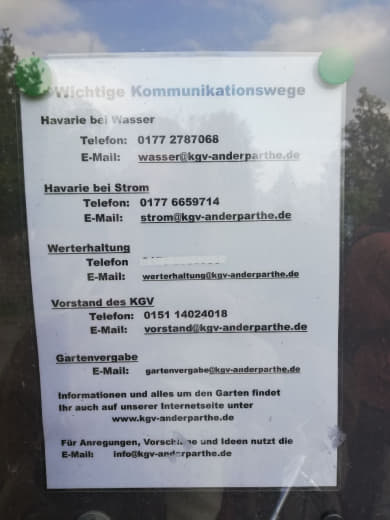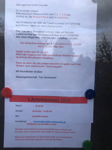 1. Wasseranschluss: 8. Und 9.4. zwischen 08:00 und 12:00 müssen die Gartentore geöffnet sein. Idealerweise ist auch jemand da. Von den am Plenum anwesenden ist niemand über Ostern da. Wenn keiner da ist lassen wir einfach das Gartentor offen.