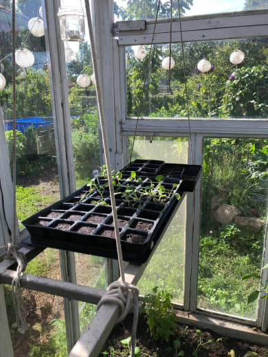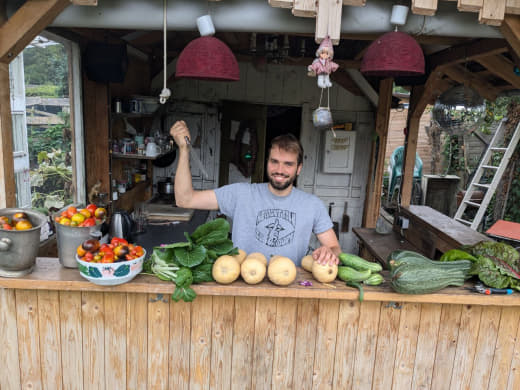 Kurzer Überblick: im großen Beet sind Mangold, Zucchini, Kartoffeln , pack Choi, Stangenbohnen und darunter Buschbohen, und Tomaten, Gewächshaus: Salat und Buschbohne , 3 Tomaten , chillis , Gurken . Drüben Tomaten, Erbsen , rotebeet , Kürbisse, Möhren ( villeicht wachsen die), Gurken . Gewächshaus klein, Tomaten und eine chilli